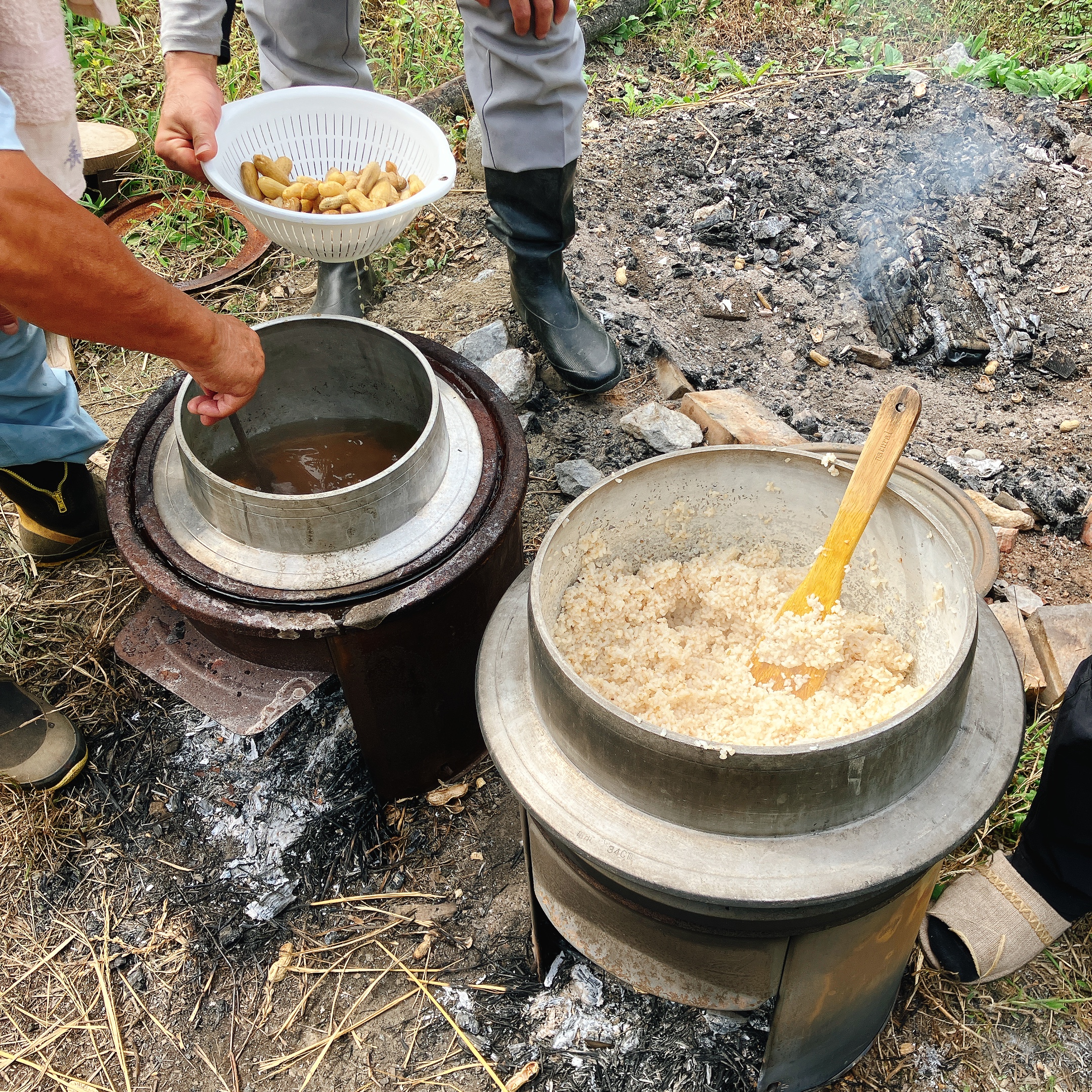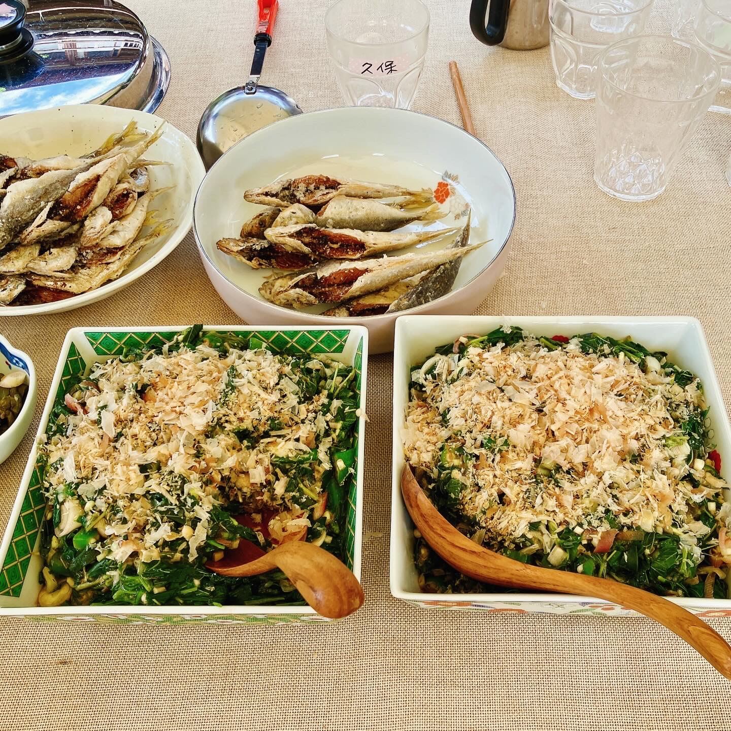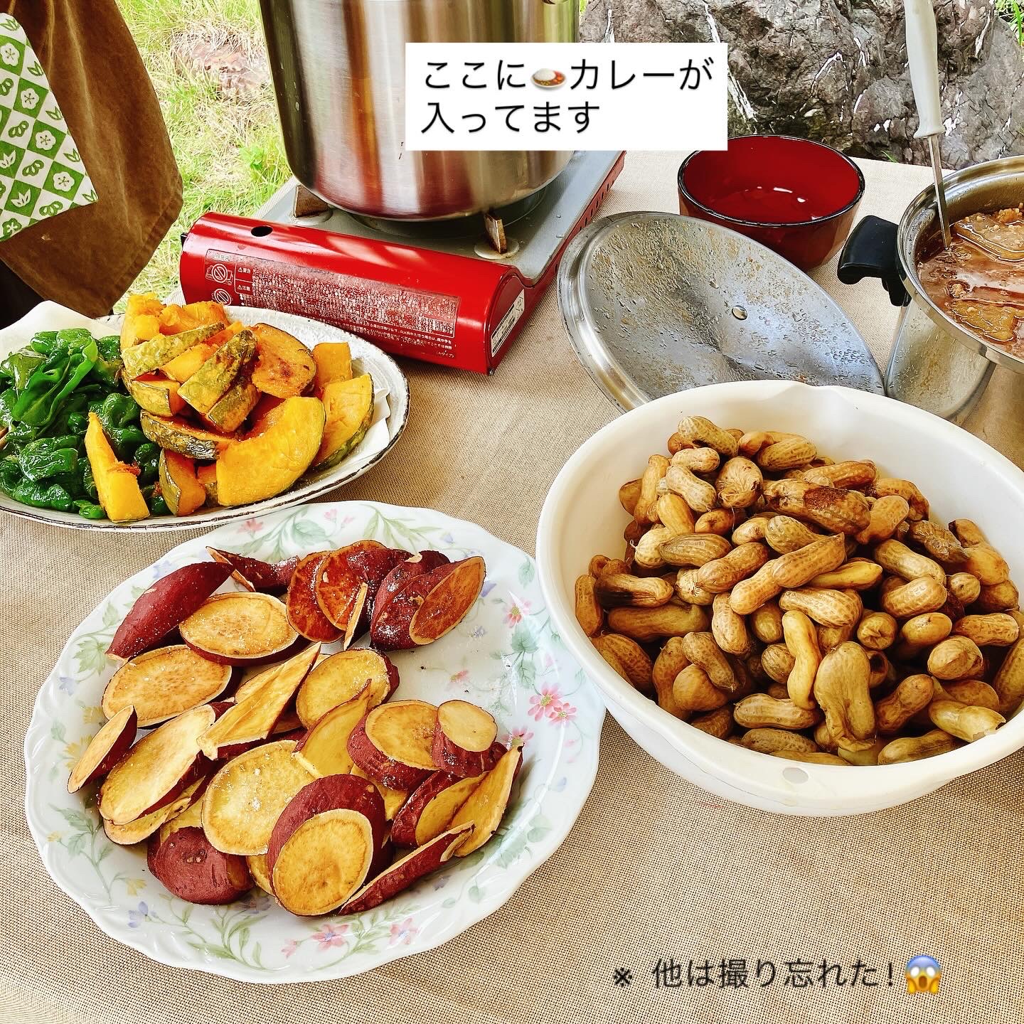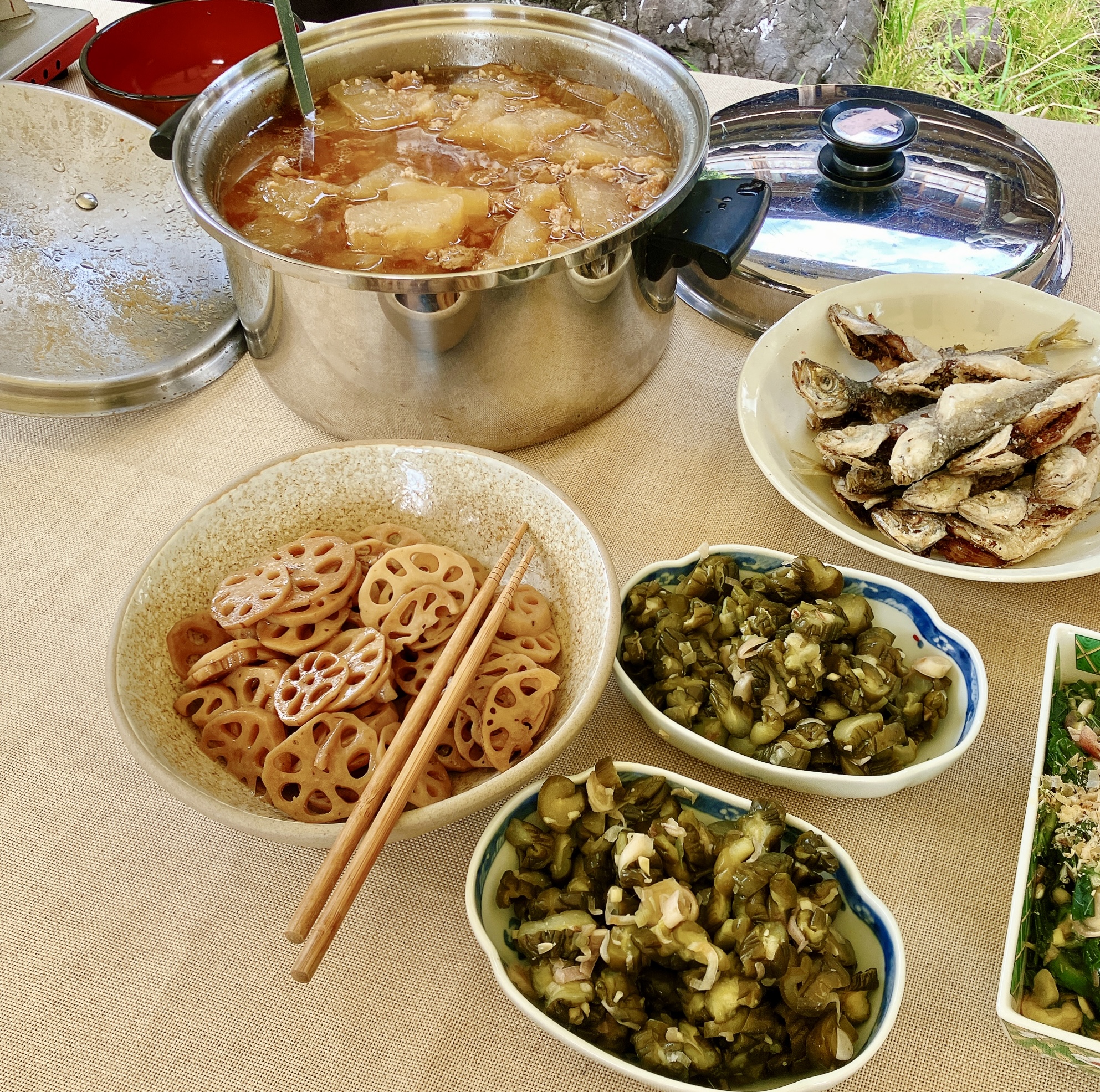 釜炊きの二分付きごはん、千葉県と言えばの茹で落花生やアジの素揚げ、漬物、煮物、カレーに唐揚げ、などなど、次から次へと本当にたくさんのおいしいお料理をいただきました。