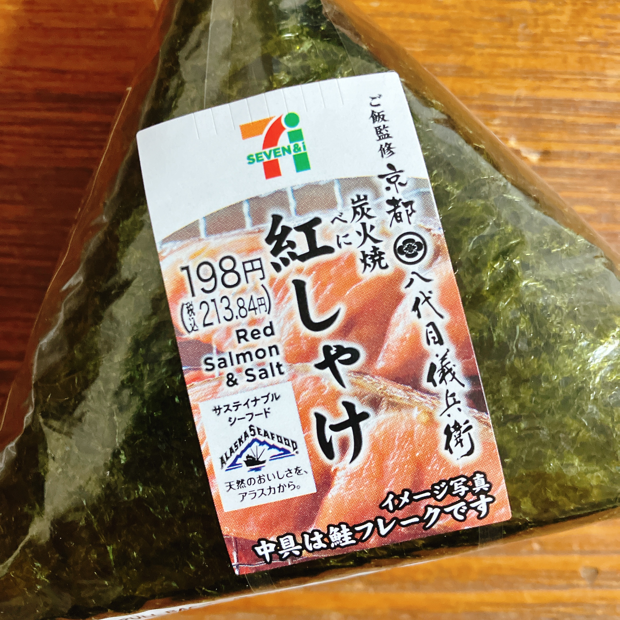 まず行きの電車の中で、娘は朝ごはんを食べました。今回は、お昼ごはんが体に優しい食べものだということは分かっていたので、コンビニでおにぎりを購入。もちろん、シンプルな具材を選びます! 今回はサステイナブルシーフードの紅しゃけ。