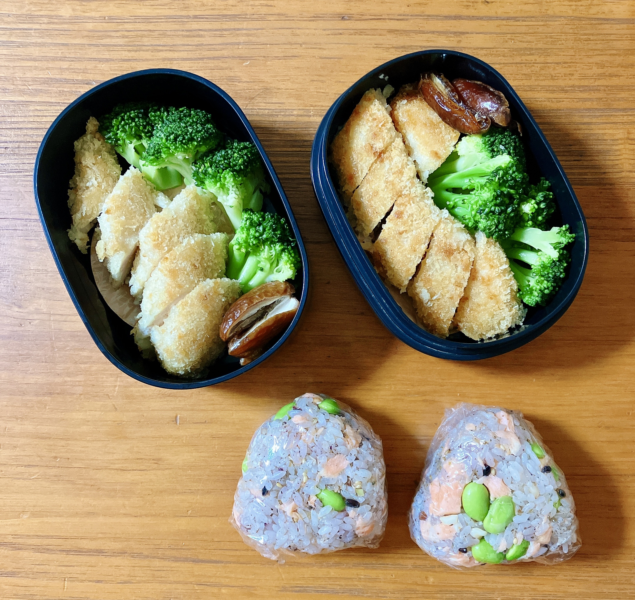 鮭のオレンジと枝豆の緑の彩りは食欲をそそり、栄養も申し分なしのおにぎりはラップで三角に握り、全て保冷剤と一緒に保冷バッグで持参しました。